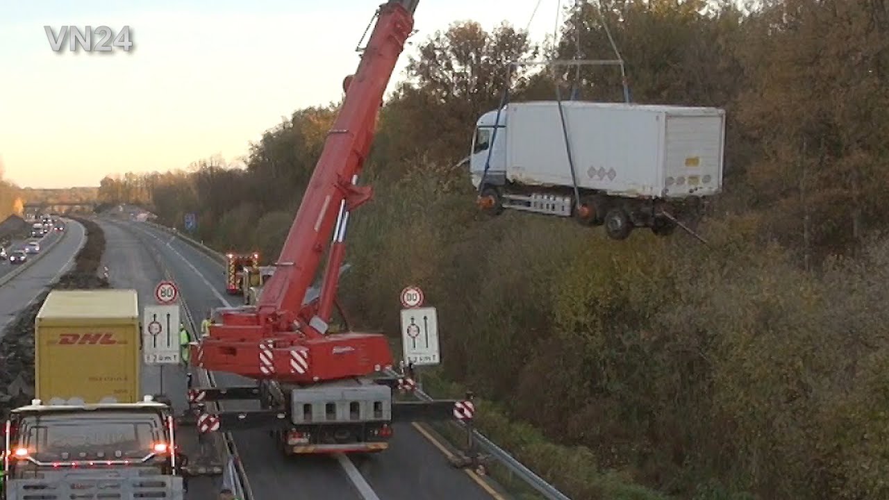 19.11.2022 – VN24 – Kran hebt Unfall LKW aus dem Wald neben der A1